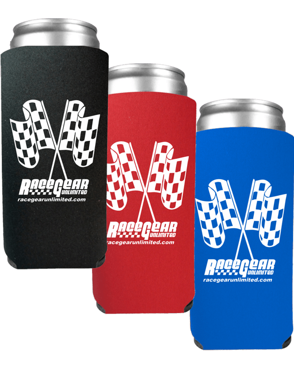Race Gear Unlimited Can Koozies for 16oz. cans. Folding foam can koozies imprinted on two sides with crossed checkered flags.