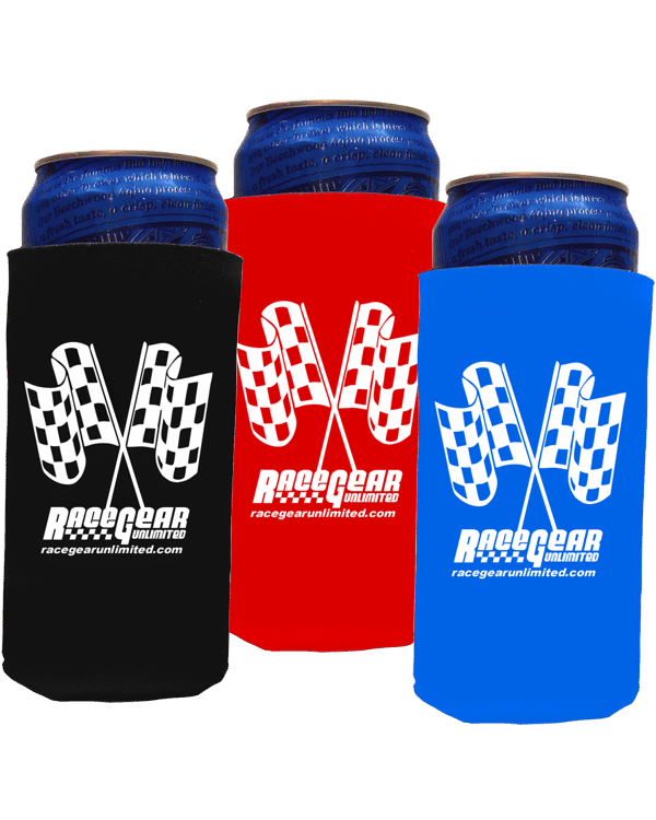Race Gear Unlimited Can Koozies for 16oz. cans. Folding foam can koozies imprinted on two sides with crossed checkered flags.